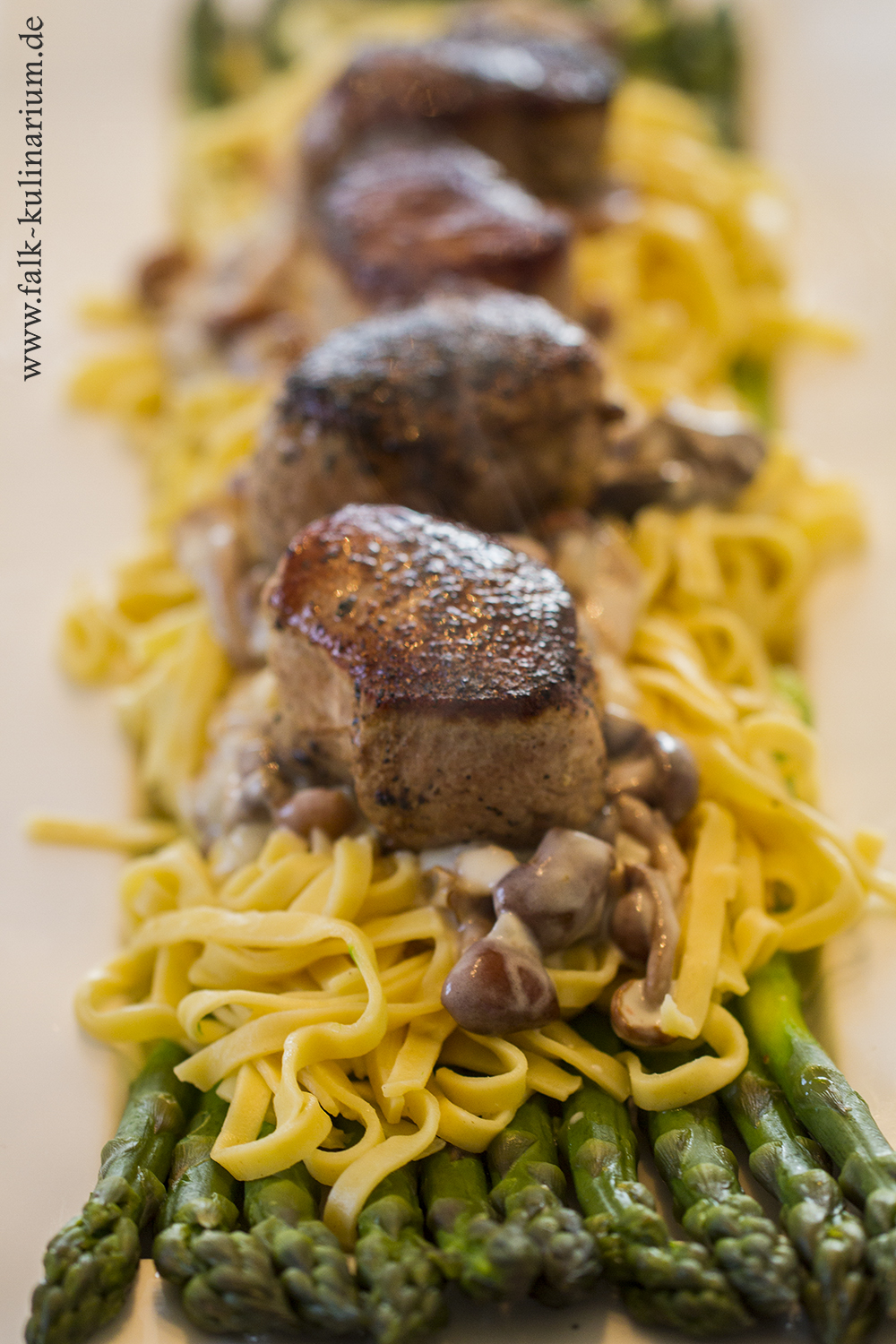 Schweinefilet mit grünem Spargel und Tagliatelle