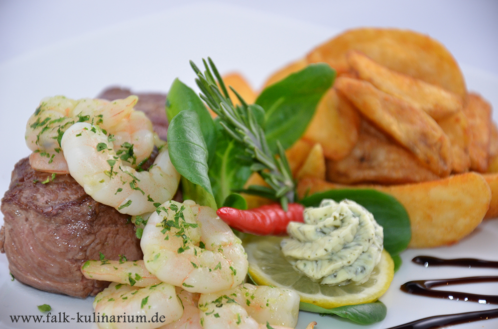 Hier ein Klassiker der amerikanischen Küche. Hier kombiniert man den saftigen Fleischgeschmack mit der knackigen Frische des Meeresfrüchte. Gut für alle, die sich nicht entscheiden möchten. Das Gericht wird klassischerweise mit Rinderfilet und Hummerschwanz serviert, wir haben uns für eine Kombination von Rumpsteak und Riesengarnelen entschieden. Dazu reichen wir ganz klassisch Kartoffelspalten, Sour Cream und einen grünen Salat.